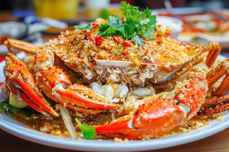 I granchi verdi di Cát Bà sono molto apprezzati per la loro freschezza e la carne dolce e succosa. Vengono spesso cotti al vapore con citronella profumata, un metodo che preserva la tenerezza della polpa e ne esalta il sapore naturale. Tradizionalmente sono serviti con salsa di pesce leggermente acidula o con una salsa piccante al peperoncino, per un’esperienza di mare semplice ma memorabile.