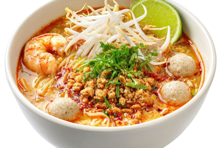 Il Bánh Đa Cua è una zuppa tradizionale ricca e profumata, preparata con brodo di frutti di mare. Il piatto è arricchito da polpette di granchio, tortini di pesce avvolti in foglie e abbondanti erbe aromatiche fresche. Ogni cucchiaiata offre un perfetto equilibrio tra note dolci, salate e aromatiche, rendendo questa specialità particolarmente amata nelle regioni costiere del Nord Vietnam.