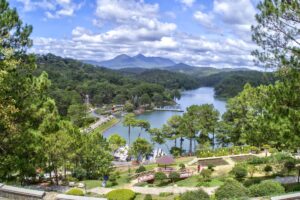 La Valle dell’Amore è circondata da foreste di pini e dolci colline, creando un’atmosfera romantica per coppie e famiglie. L’area comprende laghi, giardini e sentieri per passeggiare. I visitatori possono andare in bicicletta o fare un giro in barca godendosi il paesaggio tranquillo. Rimane uno dei parchi più iconici di Da Lat.