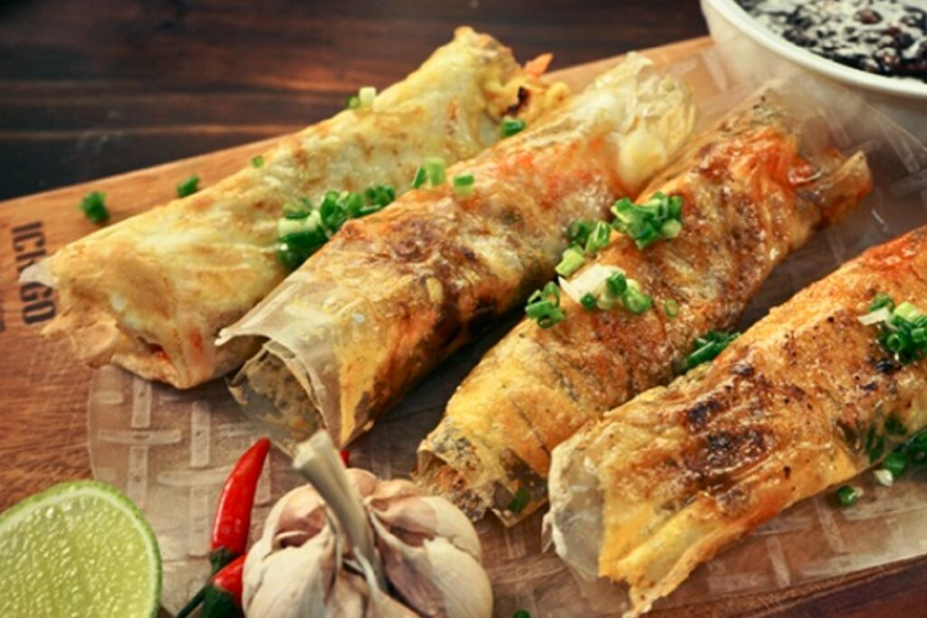 La carta di riso viene guarnita con pasta di gamberi fermentata, uova, cipollotto e peperoncino, poi grigliata sul carbone fino a diventare perfettamente croccante. Il sapore affumicato si combina perfettamente con il condimento salato e leggermente dolce. Ogni morso offre croccantezza, piccantezza e umami allo stesso tempo.