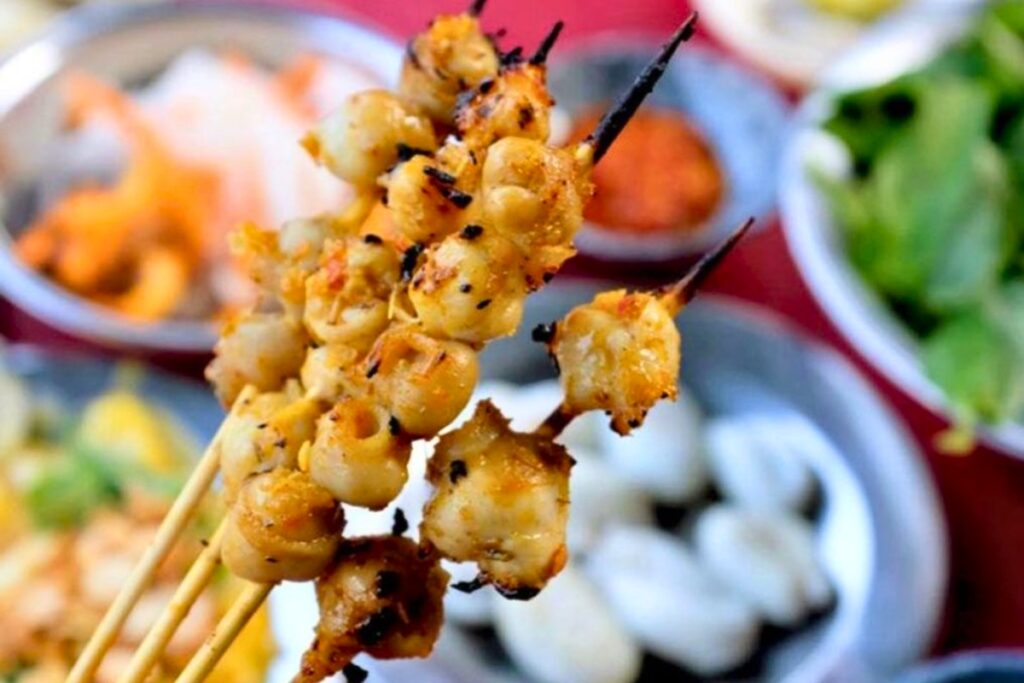 La pasta di pesce o carne viene condita, modellata e grigliata fino a diventare succosa e profumata. Gli spiedini si mangiano con carta di riso, erbe fresche e salsa da immersione, creando un’armonia di sapori e consistenze. Il sapore affumicato della carne si abbina perfettamente con le verdure fresche.