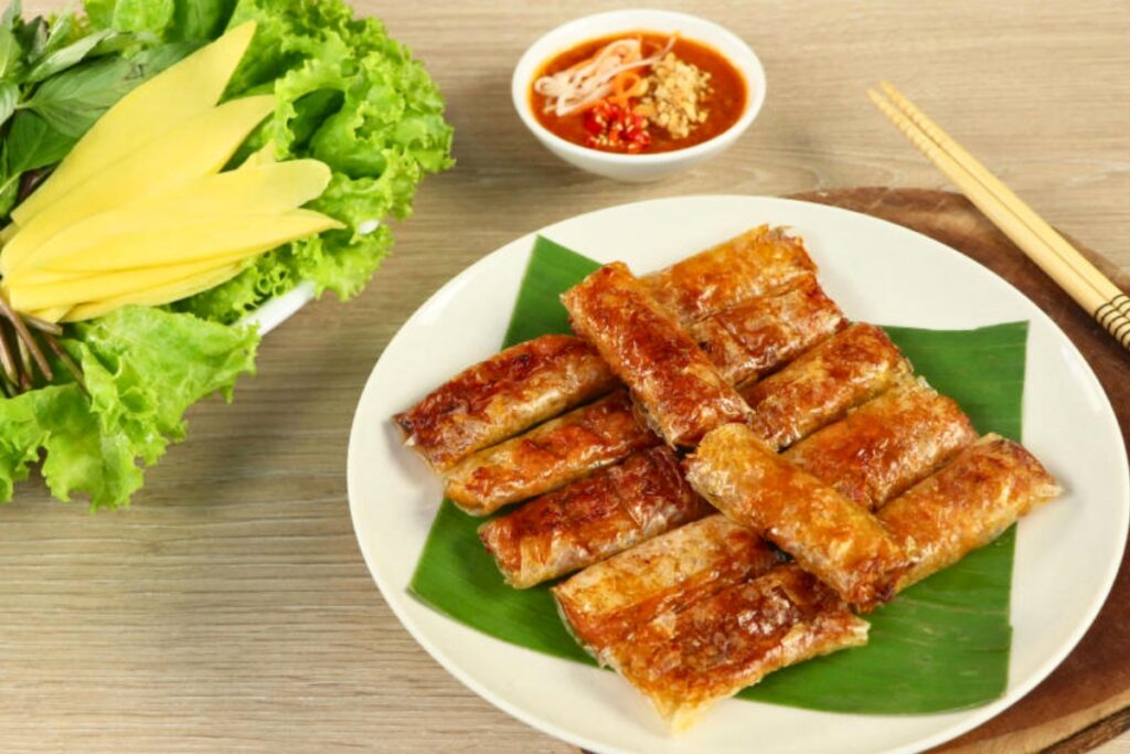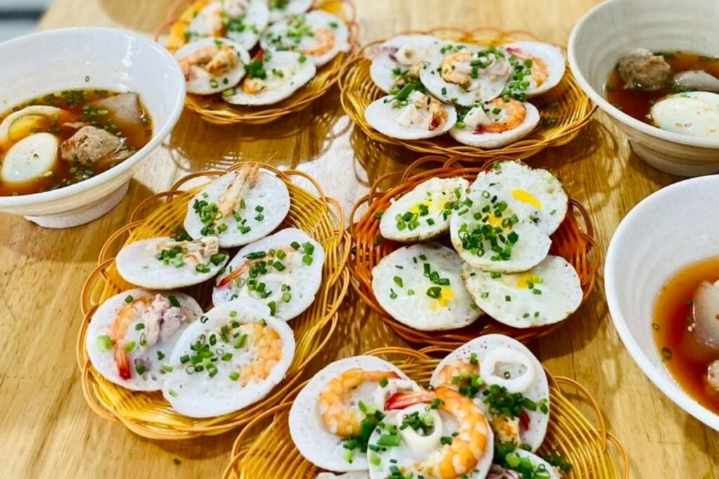 Questi piccoli pancake di farina di riso vengono cotti in stampi di terracotta sopra il carbone, creando un esterno croccante e un interno morbido e soffice. Di solito sono guarniti con gamberi, calamari o carne di maiale macinata, poi serviti con una salsa agrodolce a base di salsa di pesce, aglio, peperoncino e lime. Erbe fresche e mango verde aggiungono freschezza a ogni boccone, mentre l’aroma affumicato arricchisce il sapore.