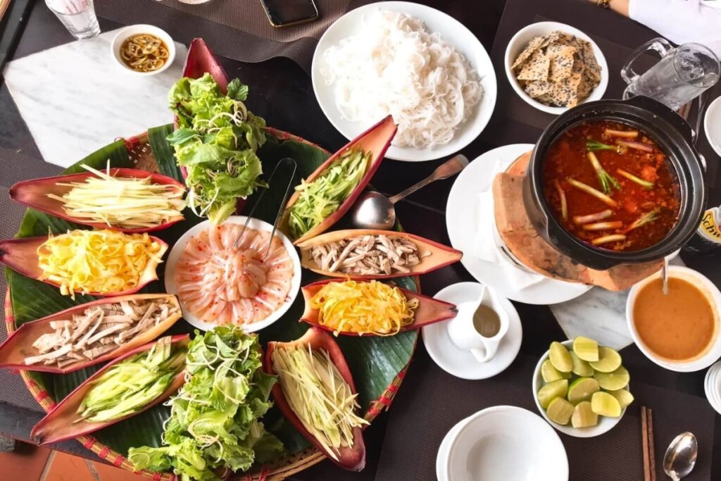 Questo particolare hotpot include pesce fresco, gamberi, erbe aromatiche, verdure e noodles di riso serviti separatamente prima di essere aggiunti a un brodo profumato di frutti di mare. L’acqua di cocco e il tamarindo donano alla zuppa un delicato equilibrio tra dolce e acido. Gli ingredienti vengono immersi in una salsa speciale per un sapore ancora più intenso.