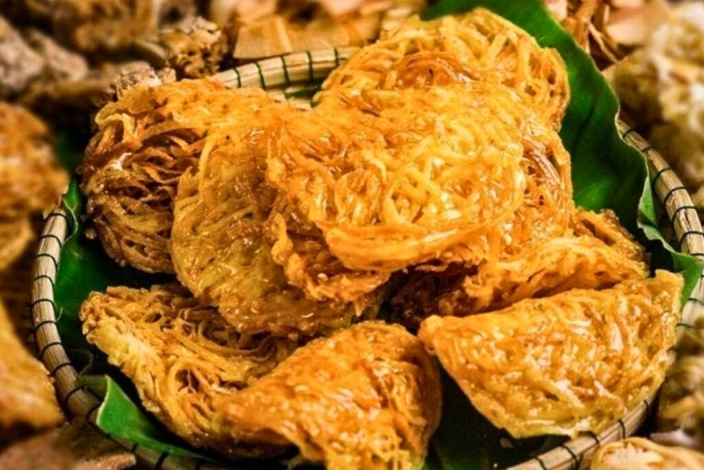 Questo dolce fritto tradizionale è preparato con sottili fette di patata dolce o manioca modellate in delicate spirali. Il dolce è leggero, croccante e leggermente dolce, perfetto come spuntino pomeridiano. La sua consistenza ariosa si abbina bene con tè o caffè. È un semplice dolce locale che mostra la creatività culinaria della regione.